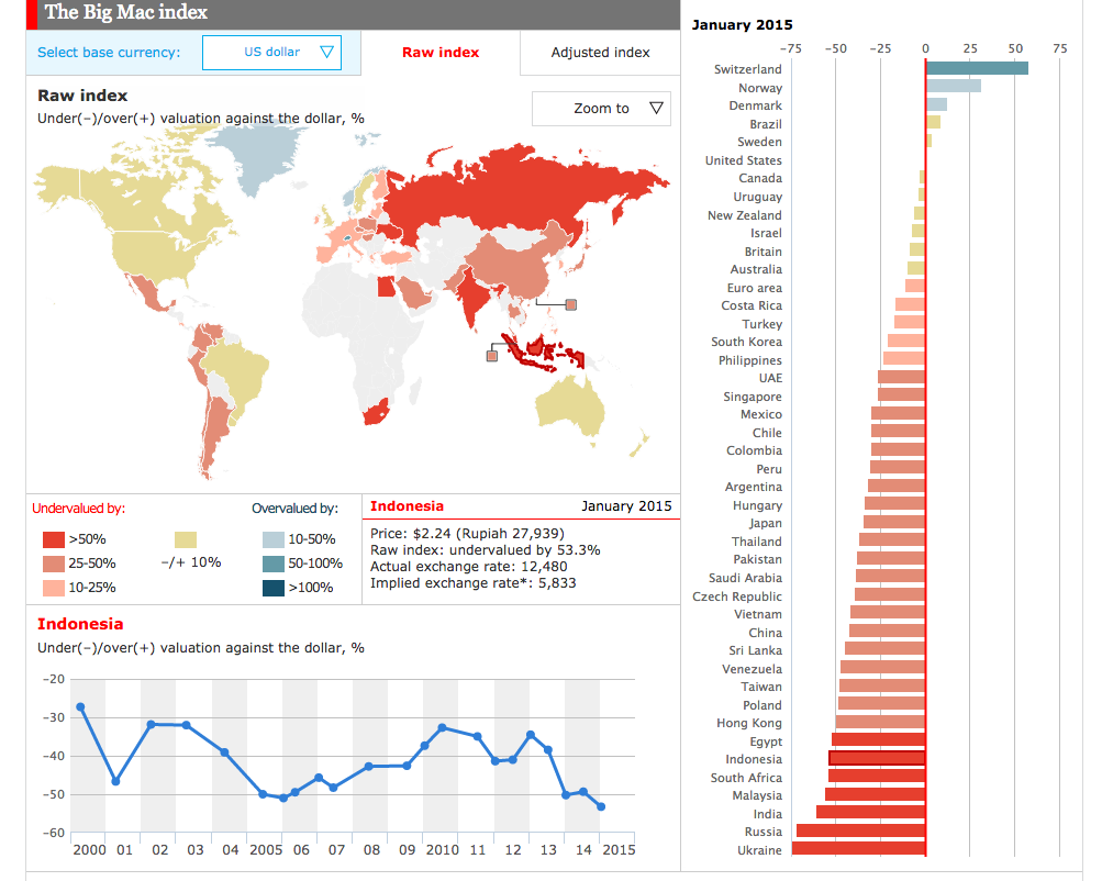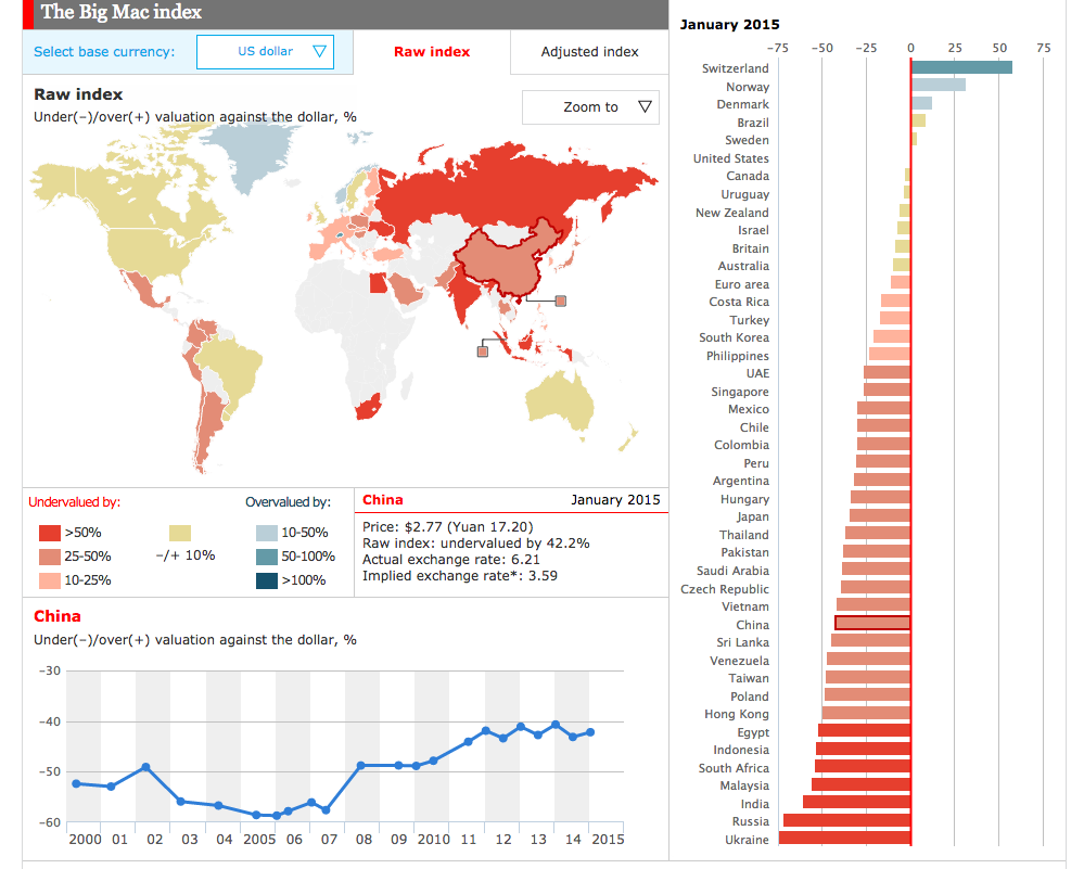 Here is a rundown from Big Macs from around the world, and a depiction of the countries’ under/ over-valuation against the US Dollar: