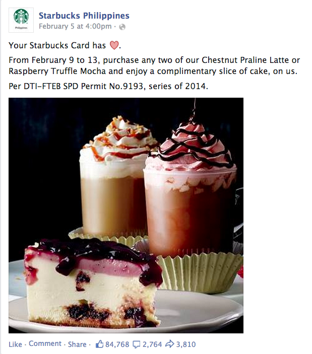 Best Valentine’s Food Promo: Starbucks Complimentary Cake