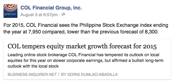 As recently as May 2015 in the Philippine Retail Investment Conference (see related post here), April Lee Tan, research head of COL Financial, reiterated the high forecast. I swear I heard even her say 8,500 (it’s in my notes y’all). She stuck with the high prediction because she said that COL Financial’s method of determining the forecast was based on a meticulous bottom-up approach (translation: they analyzed the fundamentals of the individual stocks that comprised the PSEi).